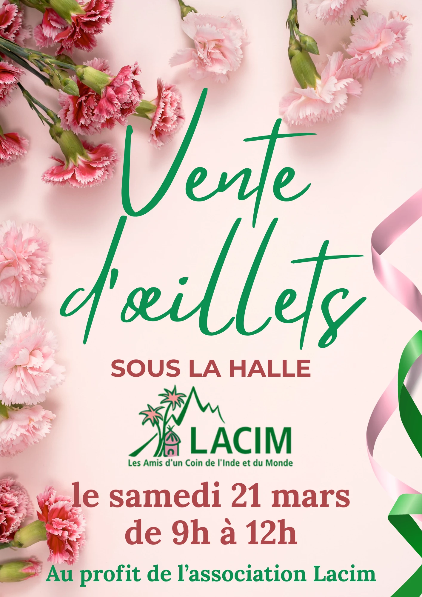 L'association LACIM - Les Amis d'un Coin de l'Inde et du Monde - organise une vente d'œillets sous la halle au profit de ses actions solidaires.